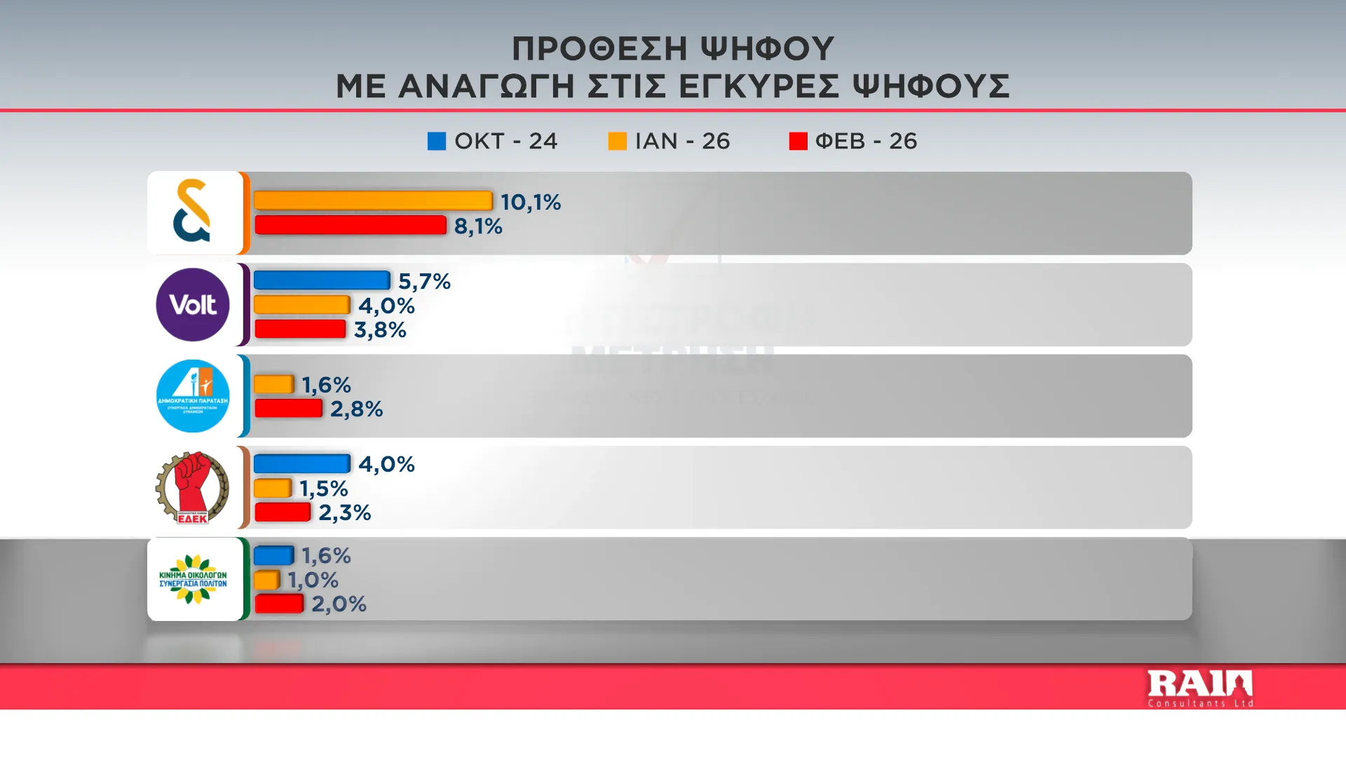 Στον αντίποδα, η «Άμεση Δημοκρατία» του Φειδία Παναγιώτου καταγράφει απώλειες της τάξης του 1,1%, μετά και την αναφορά σε «πελλούς» για παραθλητές και τις πληροφορίες για έρευνα από την Ευρωπαϊκή Εισαγγελία για ενδεχόμενη διασπάθιση ενωσιακών κονδυλίων.