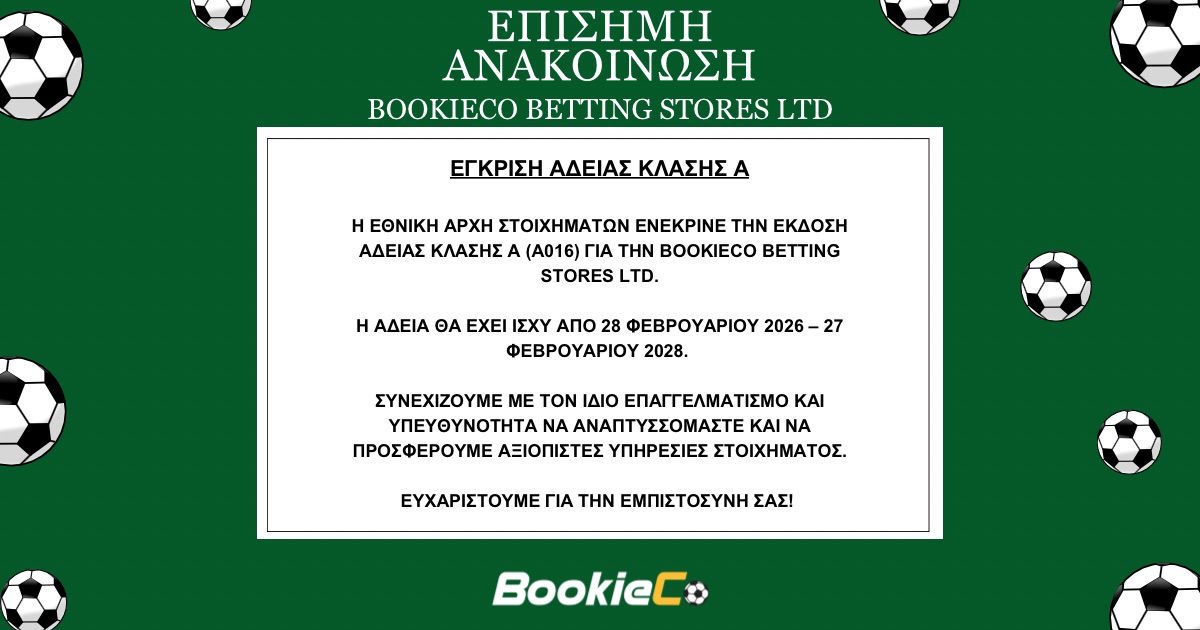 Η BOOKIECO BETTING STORES LTD ανακοινώνει με ιδιαίτερη ικανοποίηση ότι η Εθνική Αρχή Στοιχημάτων Κύπρου ενέκρινε την αίτηση για την έκδοση **Άδειας Κλάσης Α** στο όνομα της εταιρείας, με **αριθμό άδειας A016**.