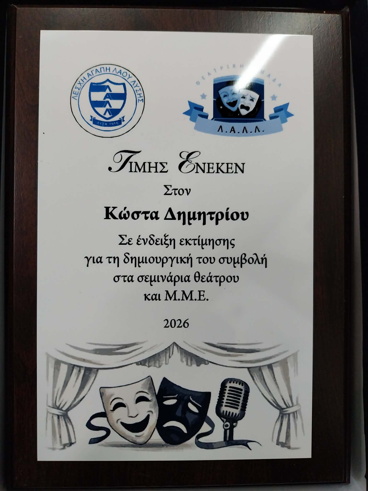 Το βράδυ της Πέμπτης στο Πολιτιστικό Κέντρο Δήμου Λύσης “Παύλος Λιασίδης”, η Λ.Α.Λ.Λ. και η Θεατρική της ομάδα, είχε την τιμή και τη χαρά να φιλοξενήσει για το πρώτο σεμινάριο Θεάτρου & Μ.Μ.Ε.τον μοναδικό, Κώστα Δημητρίου.