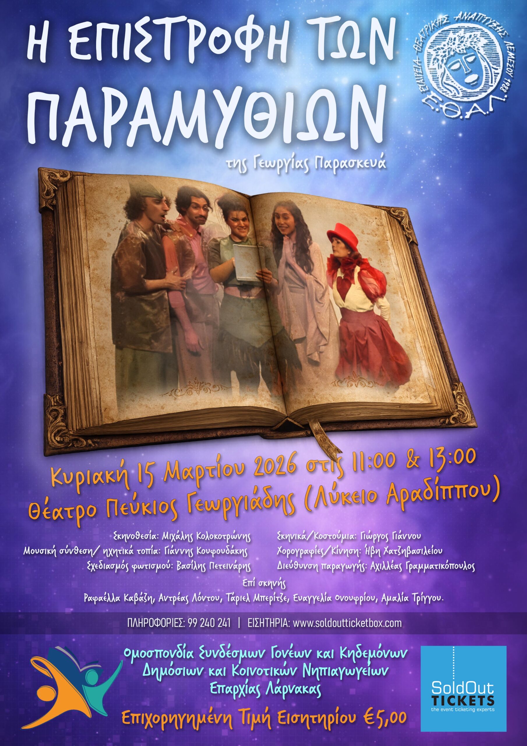 Η Ομοσπονδία Συνδέσμων Γονέων και Κηδεμόνων Δημόσιων και Κοινοτικών Νηπιαγωγείων Λάρνακας διοργανώνει τη θεατρική παράσταση “Η Επιστροφή των Παραμυθιών” στις 15 Μαρτίου με δύο παραστάσεις η ώρα 11:00 και η ώρα 13:00 στο θέατρο Πεύκιος Γεωργιάδης (Λύκειο Αραδίππου).