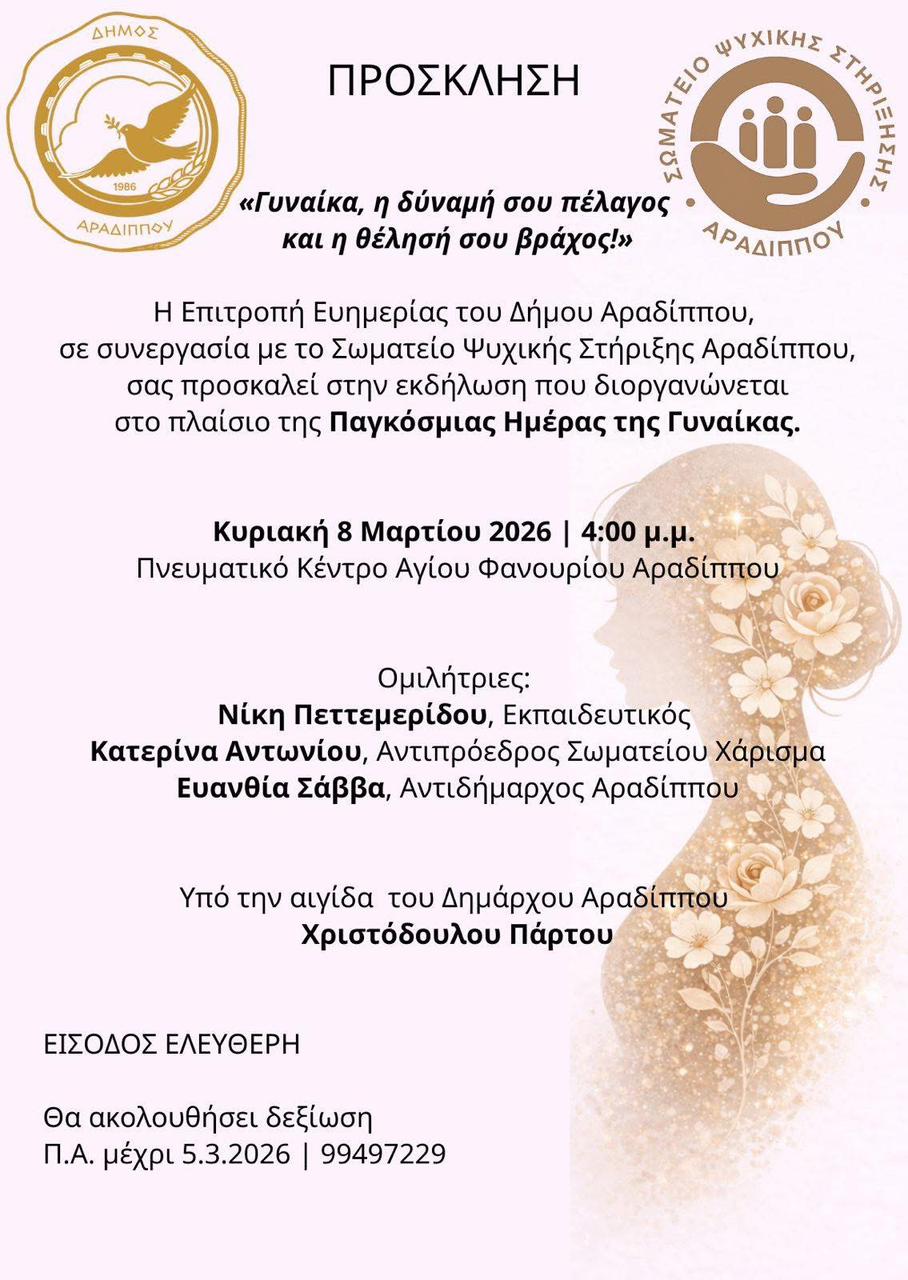 Η Επιτροπή Ευημερίας του Δήμου Αραδίππου, σε συνεργασία με το Σωματείο Ψυχικής Στήριξης Αραδίππου, σας προσκαλούν στην εκδήλωση με θέμα: «Γυναίκα, η δύναμή σου πέλαγος και η θέληση σου βράχος», τηνΚυριακή 8 Μαρτίου 2026 και ώρα 4:00 μ.μ. στο Πνευματικό Κέντρο Αγίου Φανουρίου στην Αραδίππου.