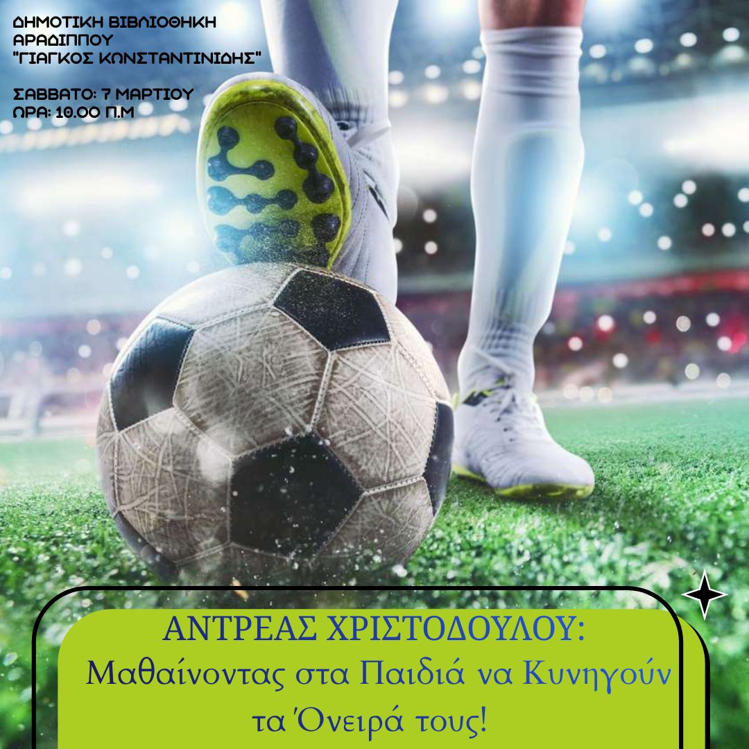 Η Δημοτική Βιβλιοθήκη Αραδίππου «Γιάγκος Κωνσταντινίδης» φιλοξενεί στις 7 Μαρτίου, στις 10:00 π.μ., τον προπονητή ποδοσφαίρου και επιχειρηματία Ανδρέα Χριστοδούλου.