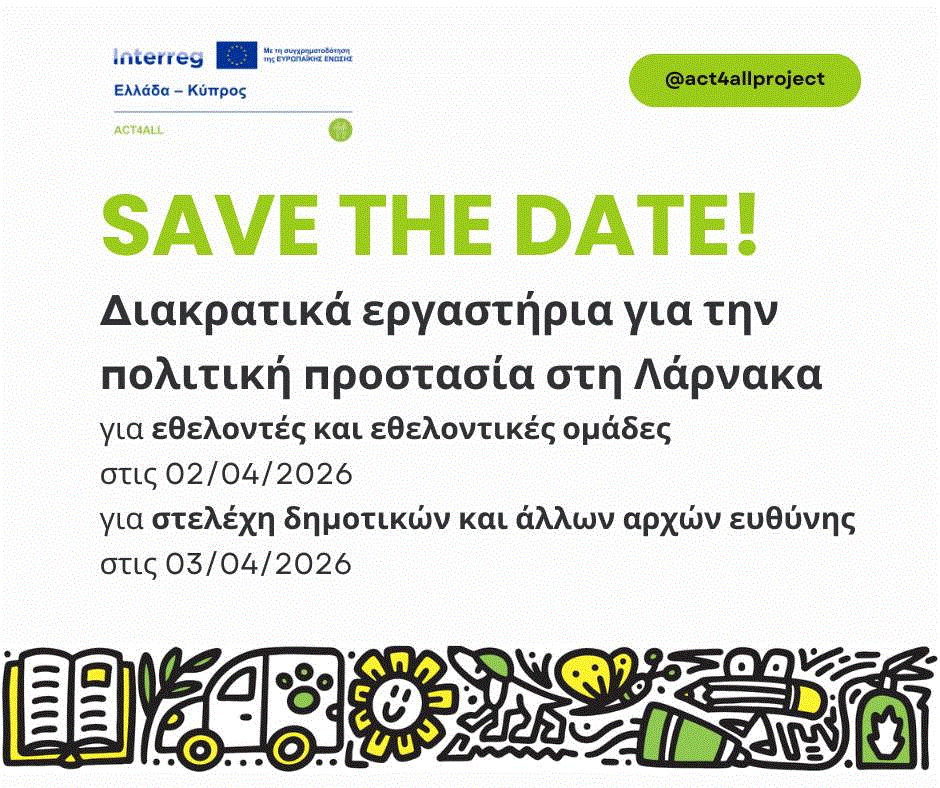 Η Αναπτυξιακή Εταιρεία Επαρχιών Λάρνακας Αμμοχώστου συμμετέχει στο έργο «Ενίσχυση της κοινωνικής ανθεκτικότητας και της συμμετοχής των πολιτών στην πρόληψη και αντιμετώπιση κινδύνων από φυσικές καταστροφές» με ακρωνύμιο ACT4ALL. Το έργο χρηματοδοτείται από το Πρόγραμμα Συνεργασίας INTERREG VI-A Ελλάδα – Κύπρος 2021-2027.
