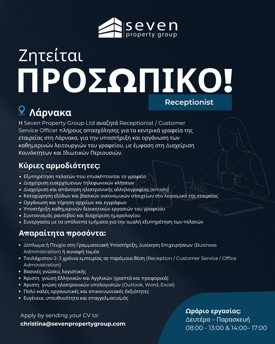 Η Seven Property Group Ltd αναζητά Receptionist / Customer Service Officer πλήρους απασχόλησης για τα κεντρικά γραφεία της εταιρείας στη Λάρνακα, για την υποστήριξη και οργάνωση των καθημερινών λειτουργιών του γραφείου, με έμφαση στη Διαχείριση Κοινόκτητων και Ιδιωτικών Περιουσιών.