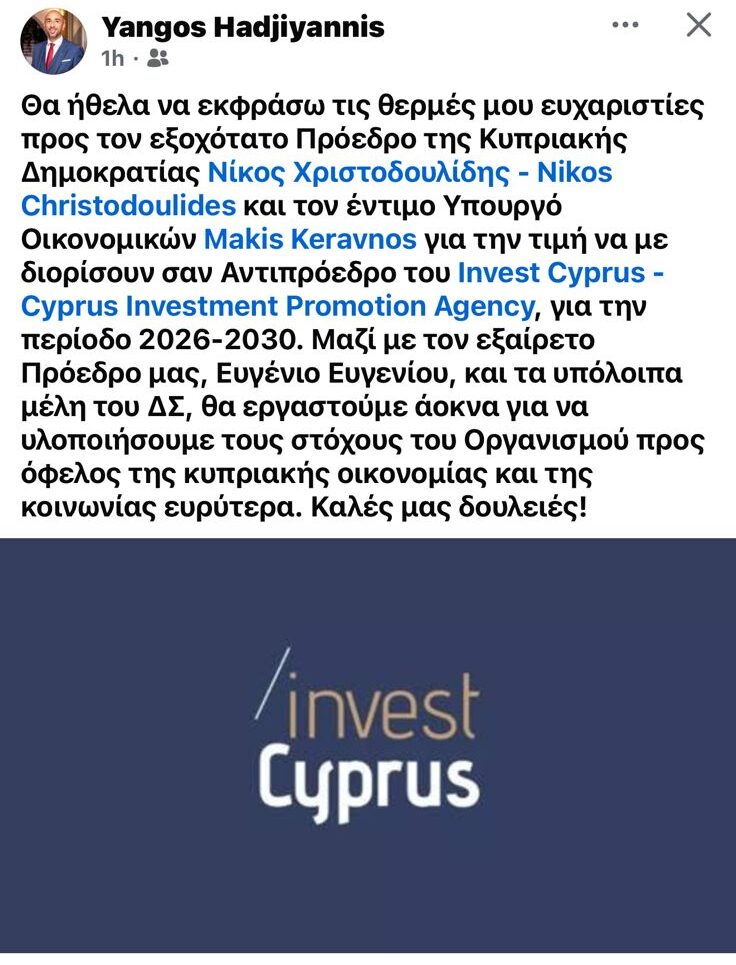 Τις ευχαριστίες του για τον διορισμό του στη θέση του Αντιπροέδρου του Invest Cyprus εξέφρασε ο Γιάγκος Χατζηγιάννης, μέσα από ανάρτησή του, υπογραμμίζοντας τη σημασία της συλλογικής προσπάθειας για την ενίσχυση της επενδυτικής παρουσίας της Κύπρου.