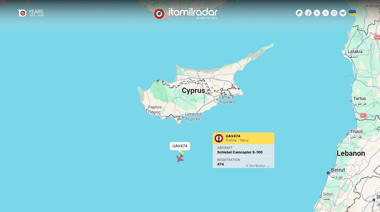 Όπως καταγράφεται από συστήματα παρακολούθησης εναέριας κυκλοφορίας, μη επανδρωμένο αεροσκάφος του γαλλικού ναυτικού τύπου Schiebel Camcopter S-100, με διακριτικό κλήσης UAV474, εντοπίστηκε να επιχειρεί πάνω από θαλάσσια περιοχή νότια της Κύπρου.