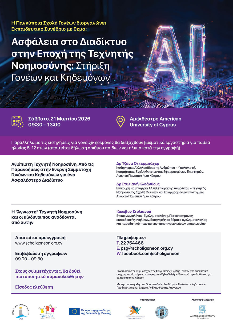 «Ασφάλεια στο Διαδίκτυο στην Εποχή της Τεχνητής Νοημοσύνης: Στήριξη Γονέων και Κηδεμόνων», το οποίο θα πραγματοποιηθεί το Σάββατο 21 Μαρτίου 2026 στο Αμφιθέατρο του American University of Cyprus στη Λάρνακα.