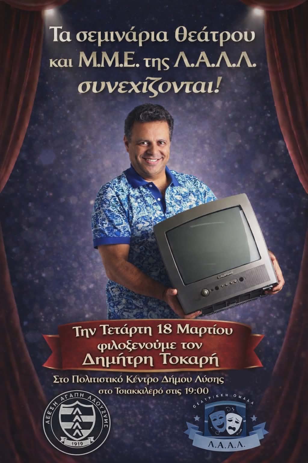 Στα πλαλισια της σειράς σεμιναρίων Θεάτρου & Μ.Μ.Ε. που διοργανώνει η θεατρική ομάδα της Λ.Α.Λ.Λ.,την Τετάρτη 18 Μαρτίου θα φιλοξενηθεί ο Σκηνοθέτης, τηλεοπτικός παραγωγός και σεναριογράφος ,Δημήτρης Τοκαρής.