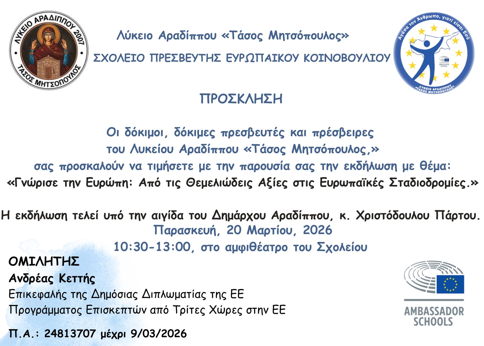 Με στόχο την ενίσχυση της ευρωπαϊκής συνείδησης και την ενημέρωση των μαθητών, για τις προοπτικές που ανοίγονται σε ευρωπαϊκό επίπεδο, το Λύκειο Αραδίππου «Τάσος Μητσόπουλος» διοργανώνει εκδήλωση με θέμα: «Γνώρισε την Ευρώπη: Από τις Θεμελιώδεις Αξίες στις Ευρωπαϊκές Σταδιοδρομίες».