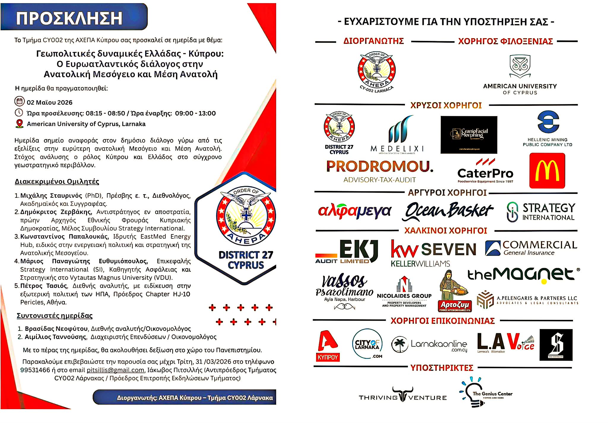 Διοργανωτής: ΑΧΕΠΑ Κύπρου – Τμήμα CY002 Λάρνακα Order of AHEPA – District 27 Cyprus