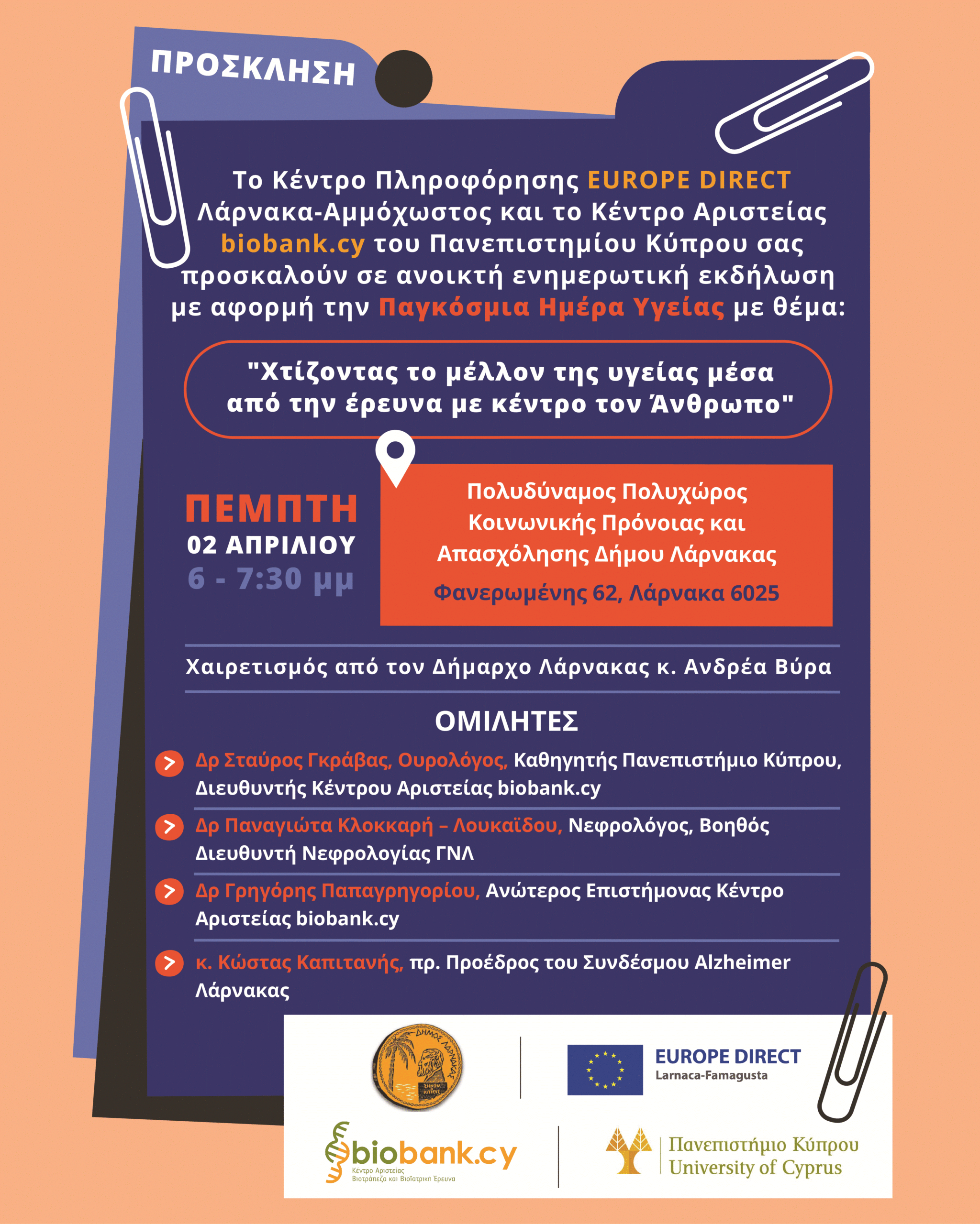 Στο πλαίσιο του ευρύτερου στόχου του Δήμου Λάρνακας για τη βελτίωση της ποιότητας ζωής των πολιτών και τη καταπολέμηση σοβαρών ασθενειών, το Κέντρο Πληροφόρησης EUROPE DIRECT Λάρνακα-Αμμόχωστος, σε συνεργασία με το Κέντρο Αριστείας για τη Βιοτράπεζα και Βιοϊατρική Έρευνα του Πανεπιστημίου Κύπρου (www.biobank.cy), θα πραγματοποιήσουν τη Πέμπτη, 2 Απριλίου, στον Πολυδύναμο Πολυχώρο Κοινωνικής Πρόνοιας και Απασχόλησης του Δήμου Λάρνακας, ανοικτή ενημερωτική εκδήλωση, με θέμα «Χτίζοντας το μέλλον της υγείας μέσα από την έρευνα, με κέντρο τον Άνθρωπο».