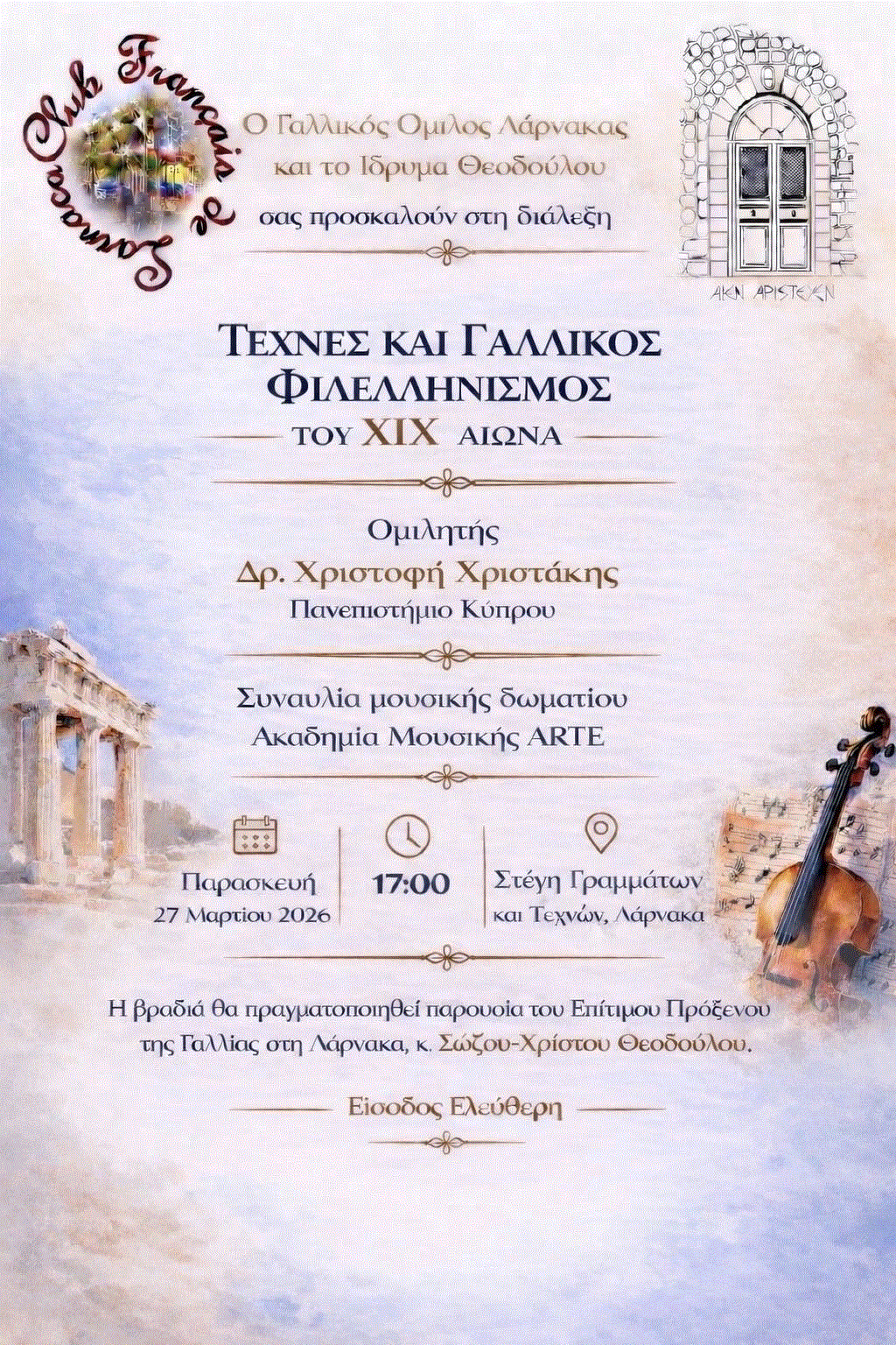 Ο Γαλλικός Όμιλος Λάρνακας και το Ίδρυμα Θεοδούλου σας προσκαλούν στη διάλεξη Τέχνες και Γαλλικός Φιλελληνισμός του ΧΙΧ Αιώνα την Παρασκευή 27 Μαρτίου 2026 και ώρα 5.00 μ.μ. στην Στέγη Γραμμάτων και Τεχνών στη Λάρνακα.