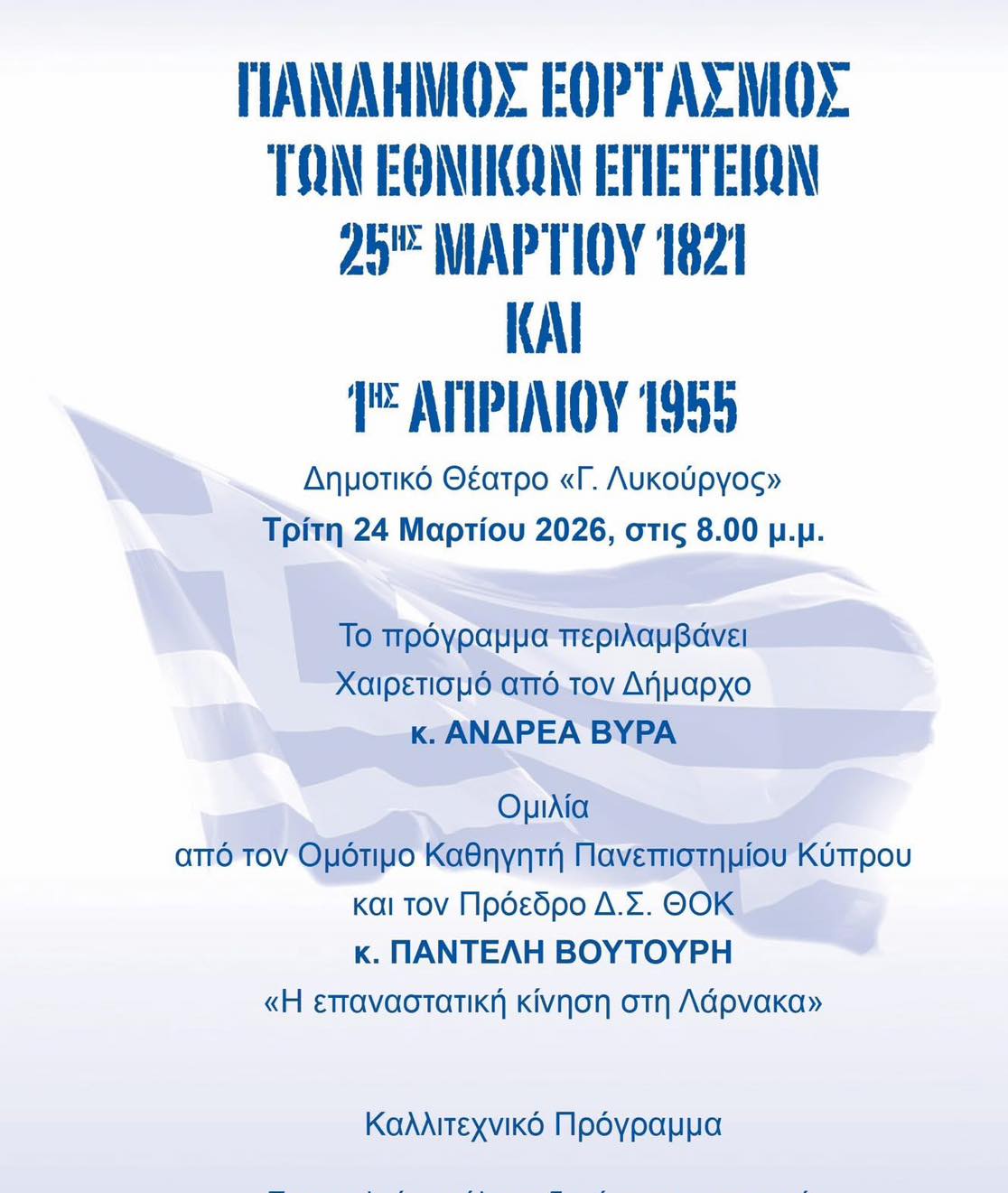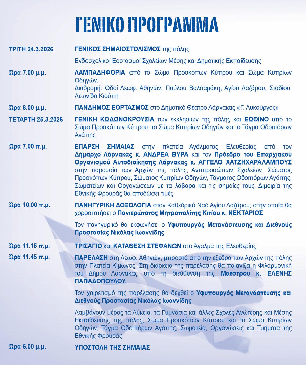 Η Λάρνακα τιμά την Εθνική Επετείο της 25ης Μαρτίου στη Λάρνακα