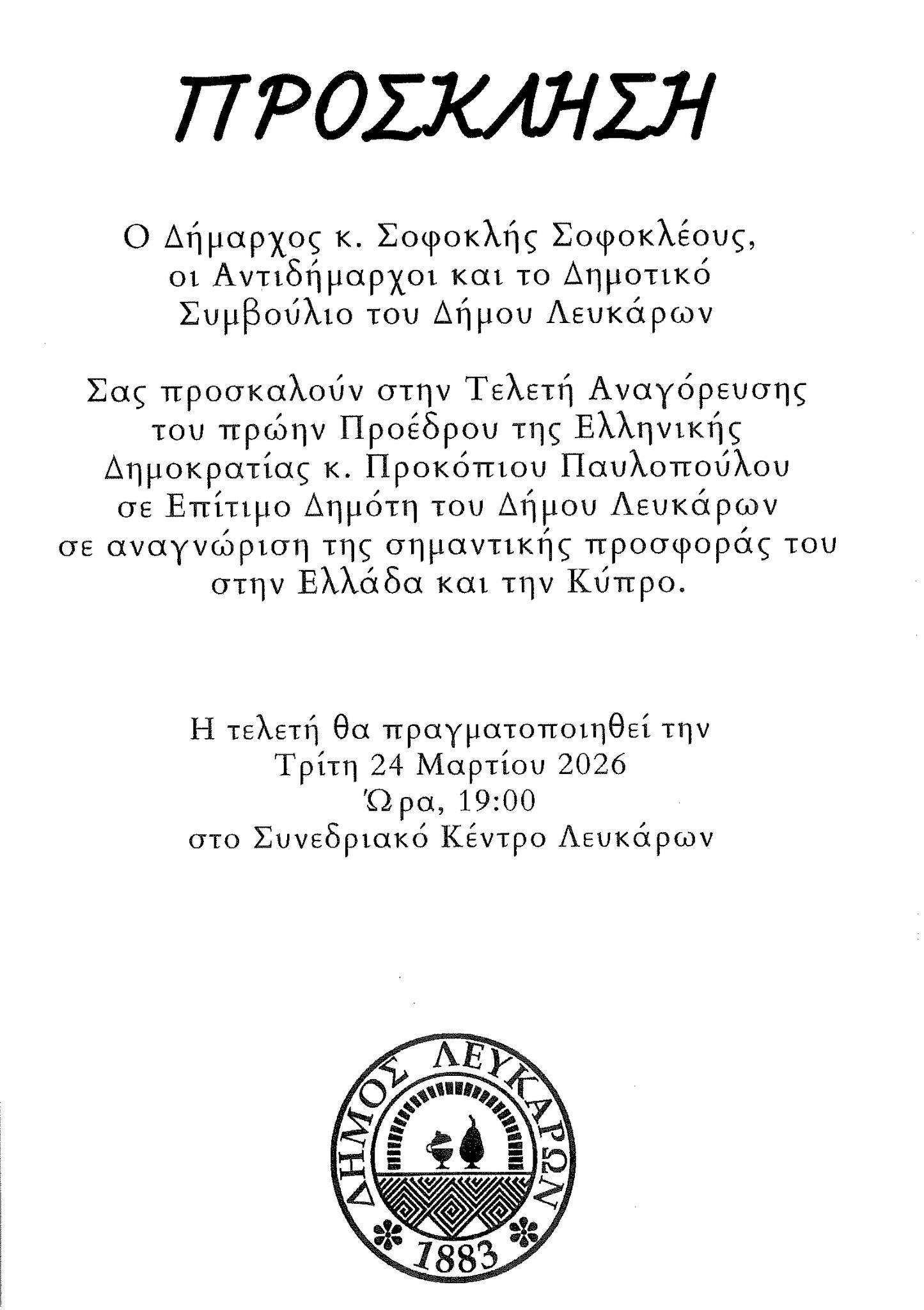 Πραγματοποιείται σήμερα Τρίτη 24 Μαρτίου 2026 και ώρα 7.00 μ.μ. στο Συνεδριακό Κέντρο Λευκάρων, η τελετή αναγόρευσης του πρώην Προέδρου της Ελληνικής Δημοκρατίας κ. Προκόπιου Παυλοπούλου σε Επίτιμο δημότη του Δήμου Λευκάρων.
