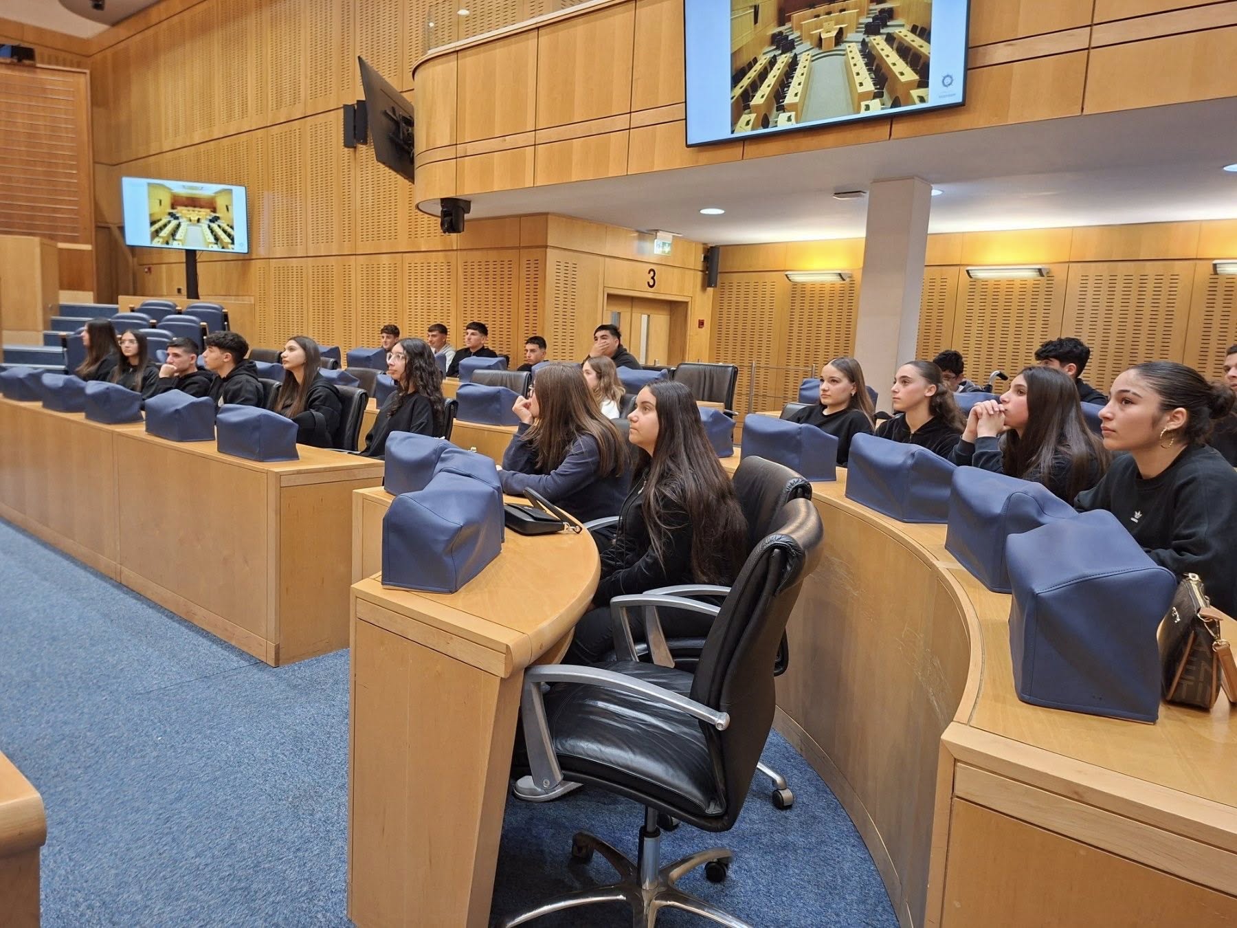 Κατά τη διάρκεια της επίσκεψης πραγματοποιήθηκε ξενάγηση στην Αίθουσα Συνεδριάσεων, όπου οι μαθητές/τριες είχαν την ευκαιρία να ενημερωθούν για το ιστορικό της Βουλής, καθώς και για τον τρόπο λειτουργίας της.