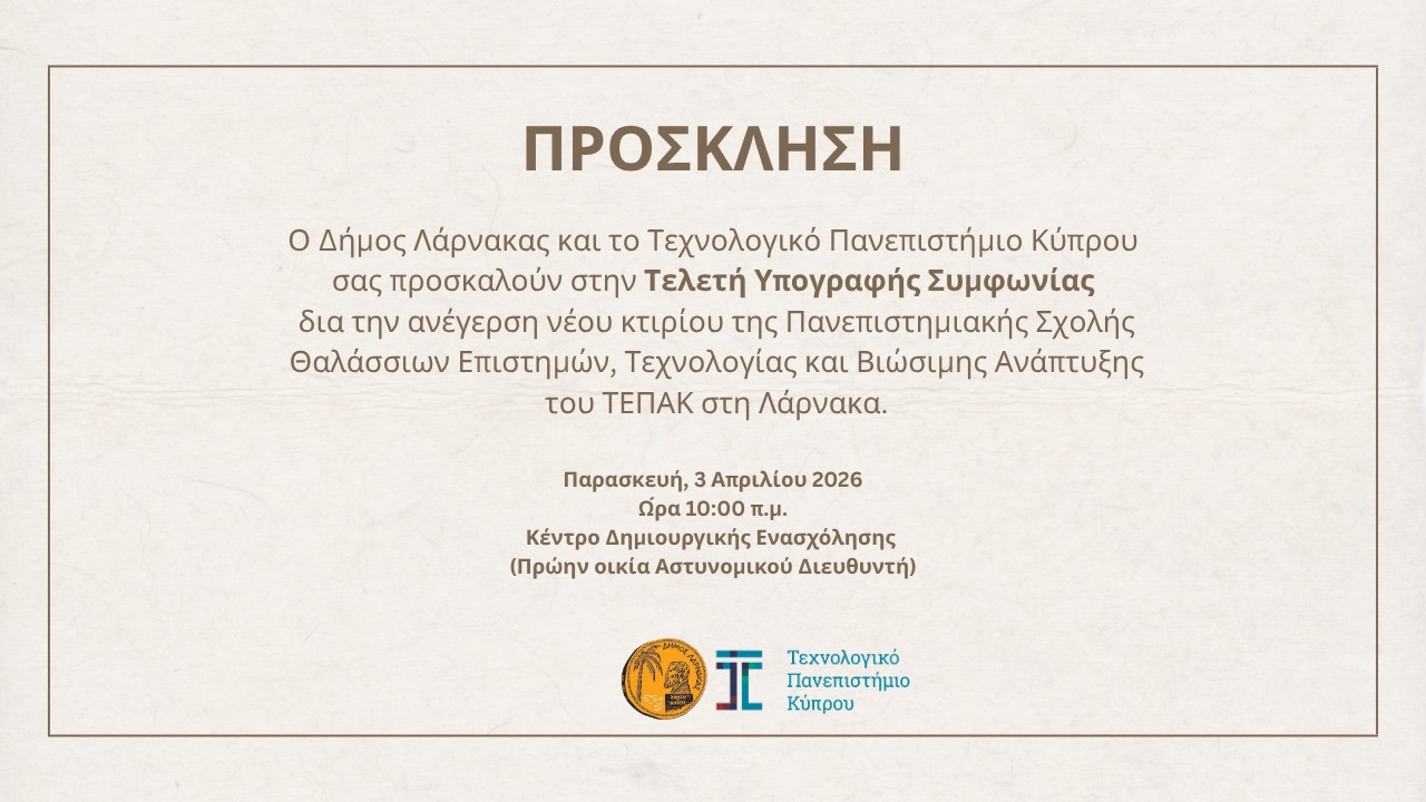 Ο Δήμος Λάρνακας και το Τεχνολογικό Πανεπιστήμιο Κύπρου σας προσκαλoύν στην Τελετή Υπογραφής της Συμφωνίας για την ανέγερση του νέου κτιρίου της Πανεπιστημιακής Σχολής Θαλάσσιων Επιστημών, Τεχνολογίας και Βιώσιμης Ανάπτυξης του ΤΕΠΑΚ στη Λάρνακα.