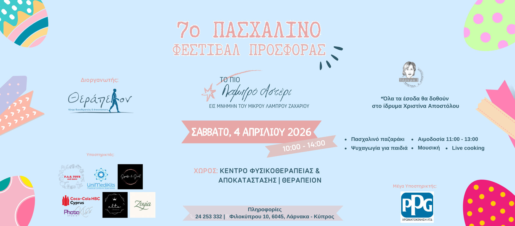 Το 7ο Πασχαλινό Φεστιβάλ Προσφοράς με τίτλο «Το πιο Λαμπρό Αστέρι», πραγματοποιείται το Σάββατο 4 Απριλίου 2026, από τις 10:00 μέχρι τις 14:00, στο Κέντρο Φυσικοθεραπείας & Αποκατάστασης Θεράπειον.