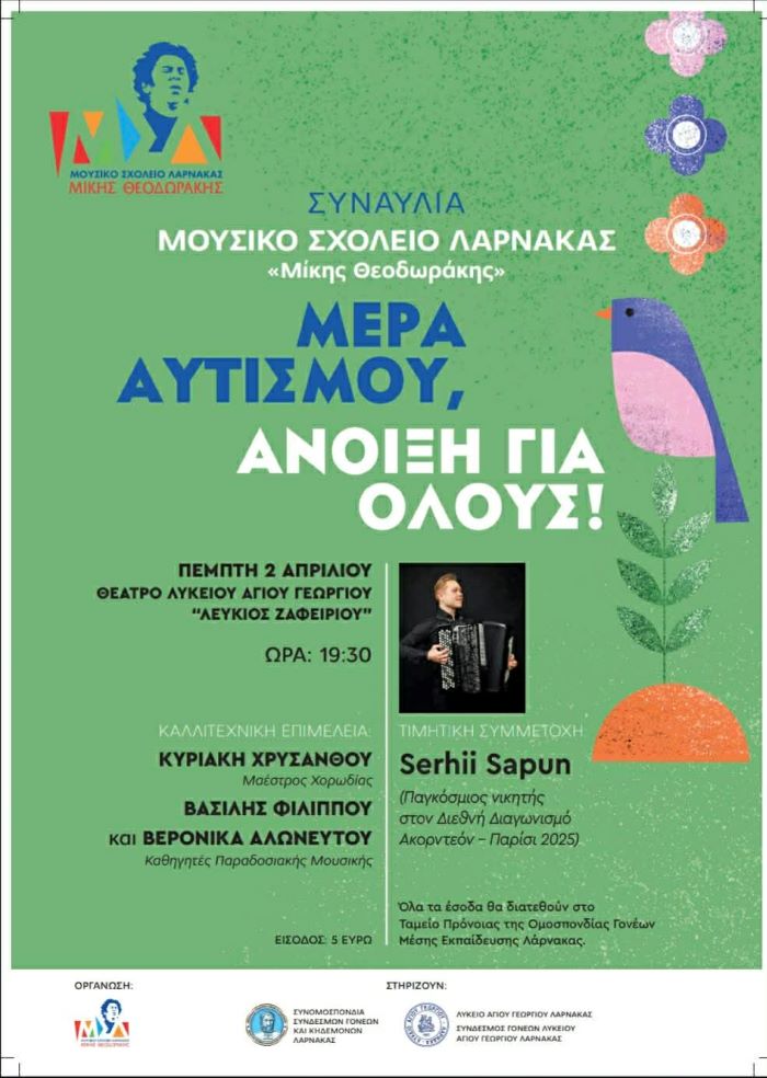 Συναυλία με τίτλο «Μέρα Αυτισμού, Ανοιχτή για Όλους!» διοργανώνει το Μουσικό Σχολείο Λάρνακας «Μίκης Θεοδωράκης», την Πέμπτη 2 Απριλίου 2026 στις 19:30, στο Θέατρο Λυκείου Αγίου Γεωργίου «Λεύκιος Ζαφειρίου».