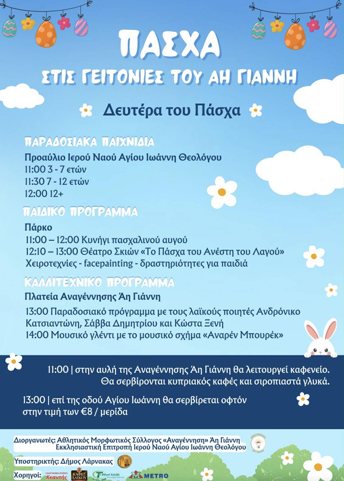 Ανακοίνωση εξέδωσε ο Ιερός Ναός του Αγίου Ιωάννη του Θεολόγου στη Λάρνακα για τις εκδηλώσεις που θα γίνουν στο προαύλιο της εκκλησίας την Δευτέρα του Πάσχα.