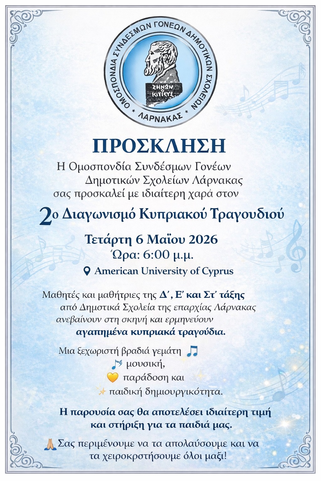 Η Ομοσπονδία Συνδέσμων Γονέων Δημοτικών Σχολείων Λάρνακας έχει την τιμή να σας προσκαλέσει στον 2ο Διαγωνισμό Κυπριακού Τραγουδιού, ο οποίος θα πραγματοποιηθεί την Τετάρτη 6 Μαΐου 2026 και ώρα 6:00 μ.μ., στο American University of Cyprus στη Λάρνακα.