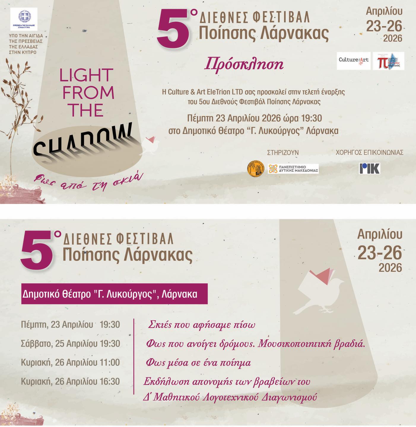 Η Λάρνακα υποδέχεται από τις 23 έως τις 26 Απριλίου 2026 το 5ο Διεθνές Φεστιβάλ Ποίησης Λάρνακας, έναν σημαντικό και πλέον εδραιωμένο θεσμό, ο οποίος προάγει τη σύγχρονη ποιητική δημιουργία, καλλιεργεί τον διαπολιτισμικό διάλογο και αναδεικνύει τη βαθύτερη σχέση της ποίησης με τις άλλες τέχνες και τη δημόσια ζωή.