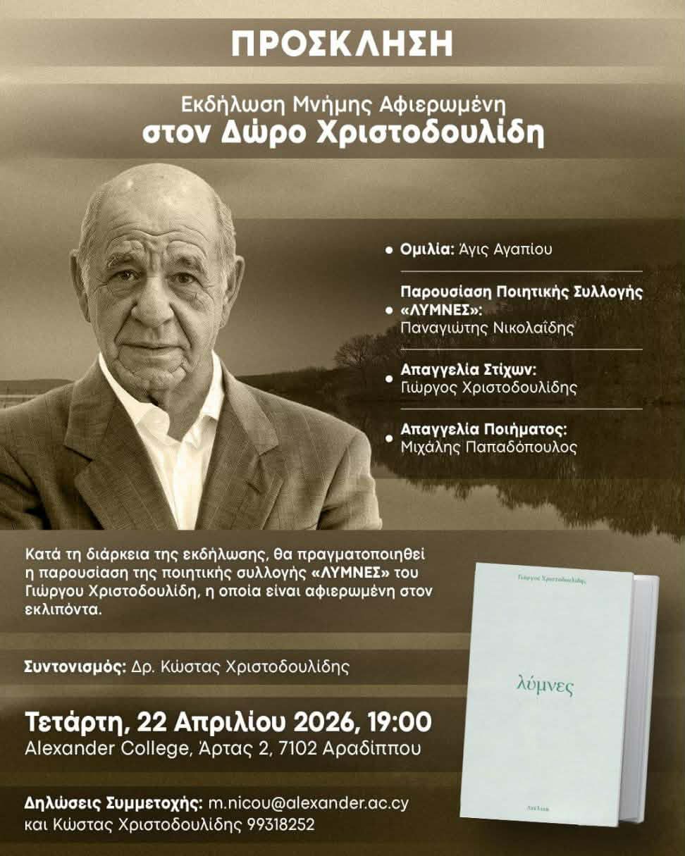 Μια ξεχωριστή βραδιά μνήμης και τιμής θα πραγματοποιηθεί την Τετάρτη 22 Απριλίου 2026, στις 19:00, στο Alexander College στην Αραδίππου, αφιερωμένη στον Δώρο Χριστοδουλίδη.