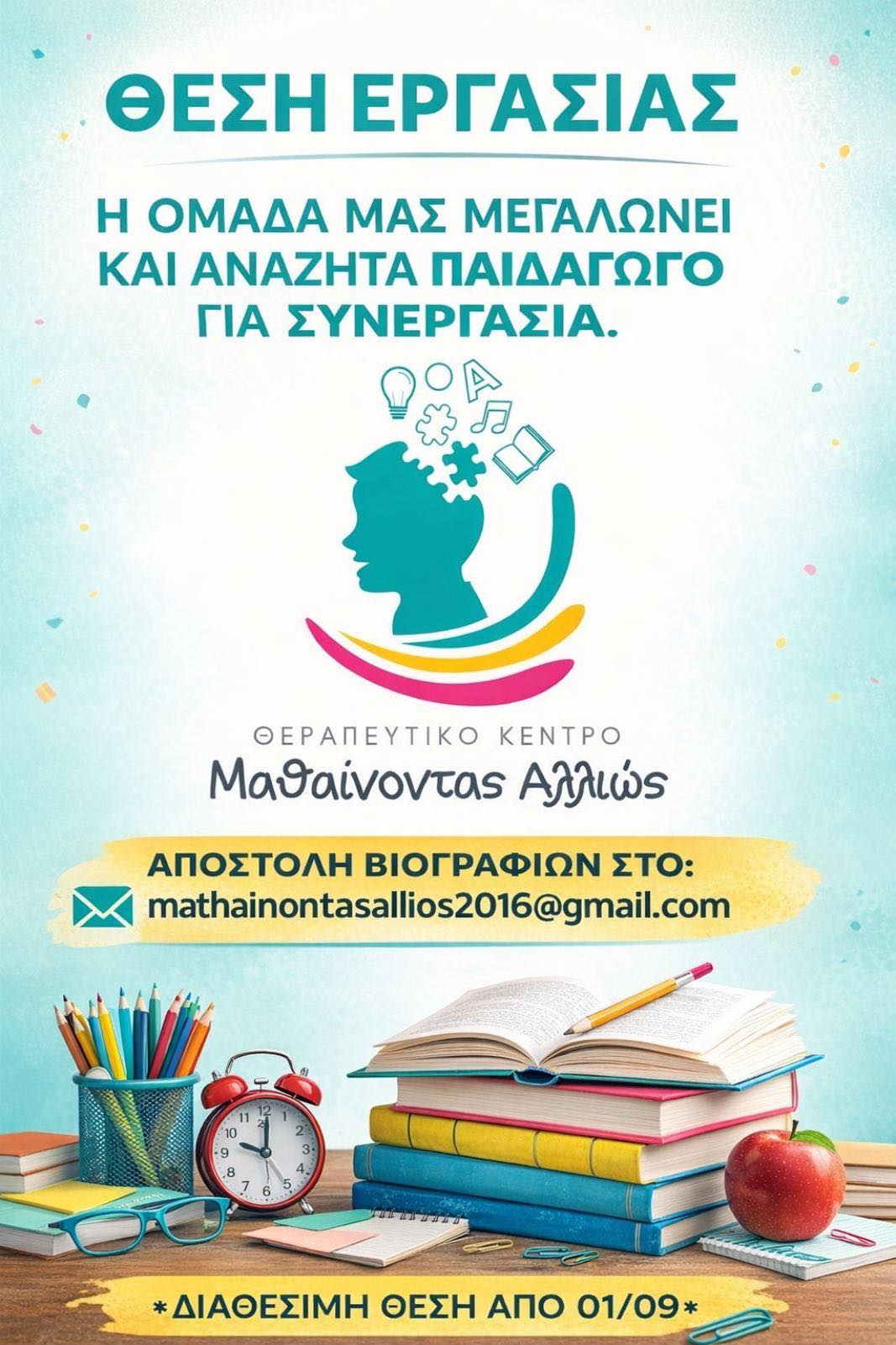 Το Θεραπευτικό Κέντρο «Μαθαίνοντας Αλλιώς» ανακοινώνει την έναρξη διαδικασίας για την πρόσληψη παιδαγωγού ή δασκάλας δημοτικού, στο πλαίσιο ενίσχυσης της ομάδας του.