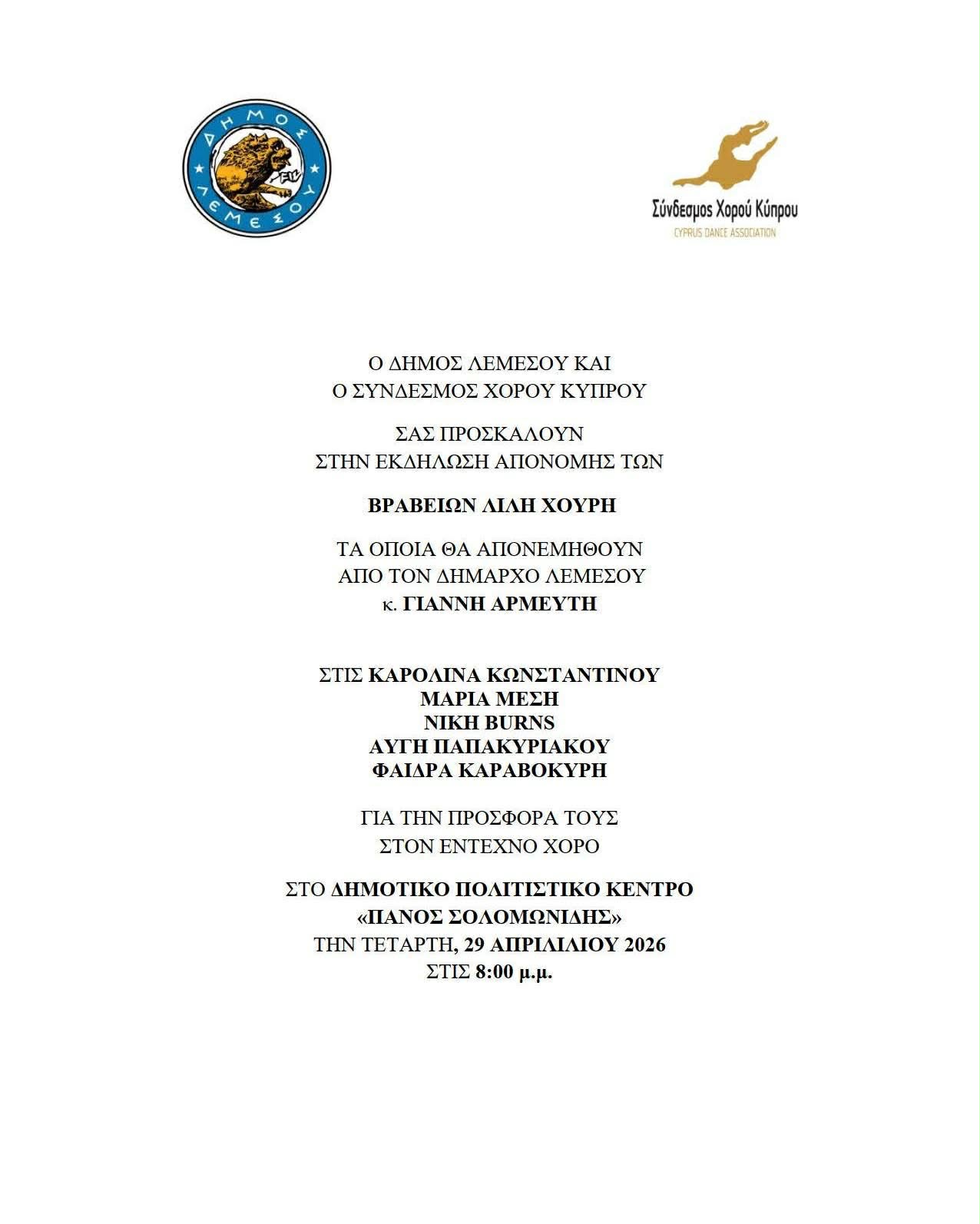 Ο Δήμος Λεμεσού σας προσκαλεί στην τελετή απονομής των βραβείων για τον “Έντεχνο Χορό” «Λίλη Χουρή» για το έτος 2026, που διοργανώνει ο Δήμος Λεμεσού, που θα πραγματοποιηθεί την Τετάρτη, 29 Απριλίου 2026 στις 8.00 μ.μ.στο Πολιτιστικό Κέντρο Πάνος Σολωμονίδης στη Λεμεσό.