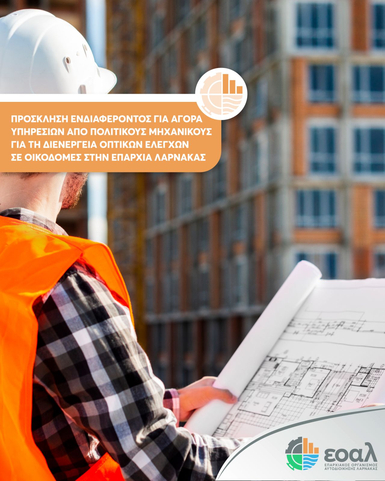 Ο Επαρχιακός Οργανισμός Αυτοδιοίκησης Λάρνακας ανακοινώνει την έναρξη υποβολής αιτήσεων για την κατάρτιση καταλόγου επαγγελματιών Πολιτικών Μηχανικών, οι οποίοι θα αναλάβουν τη διενέργεια οπτικών ελέγχων σε οικοδομές εντός της Επαρχίας Λάρνακας.
