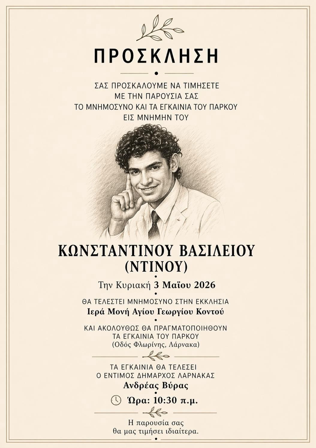 Ιδιαίτερα συγκινητική αναμένεται να είναι η ομιλία του ανιψιού του, Κωνσταντίνου Βασιλείου, 10 ετών, που φέρει το όνομά του, δίνοντας έναν βαθιά ανθρώπινο και συμβολικό τόνο στην εκδήλωση.