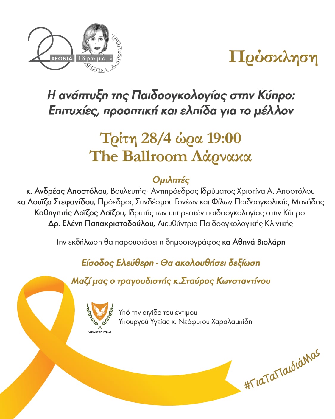 Διάλεξη με θέμα: Πώς νικούμε τον καρκίνο σε παιδιά και εφήβους: Όραμα και στρατηγική, διοργανώνεται την Τρίτη 28 Απριλίου 2026, ώρα 19:00, στη Λάρνακα, The Ballroom (Λεωφόρος Αρτέμιδος 67).
