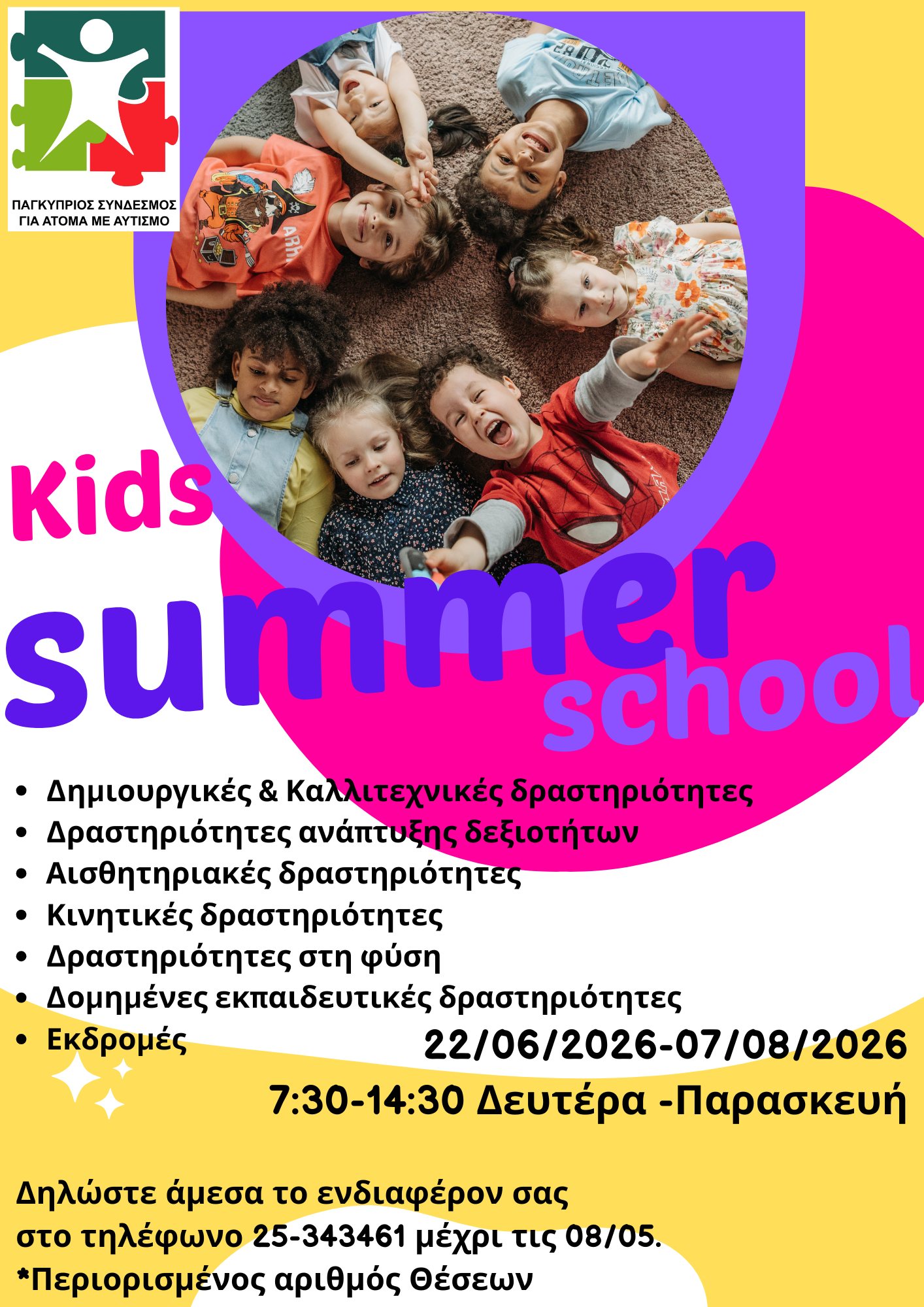 Ένα ξεχωριστό καλοκαιρινό πρόγραμμα σχεδιασμένο με αγάπη, φροντίδα και εξειδικευμένη προσέγγιση για παιδιά με αυτισμό διοργανώνει και φέτος ο Παγκύπριος Σύνδεσμος για Άτομα με Αυτισμό στην επαρχία Λεμεσού.