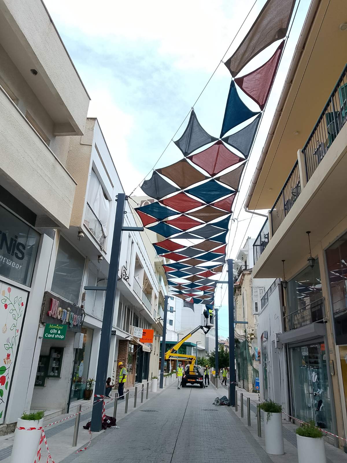 Ξεκίνησαν την Τετάρτη, 29 Απριλίου, οι εργασίες τοποθέτηση χρωματιστών σκιάστρων στην εμπορική οδό Ερμού, στη Λάρνακα. Η μερική κάλυψη των δρόμων με σκιάδια είναι έργο που έχει αποφασιστεί, σε συνεννόηση και με τους καταστηματάρχες,για προστασία των πολιτών που θα διακινούνται στο εμπορικό κέντρο από τον ήλιο και τις υψηλές θερμοκρασίες.